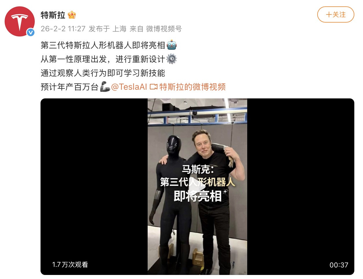 特斯拉:第三代特斯拉人形机器人即将亮相